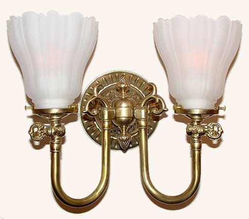 French Victorian with many details... and a slice of Art Deco. Shown with Sheffield glass shade. This satin brass beauty has class and taste. It blends in well with most any decor. Soft enough for powder room, bright enough for Hotel Lobby or dimmed for subtle restaurant lighting.