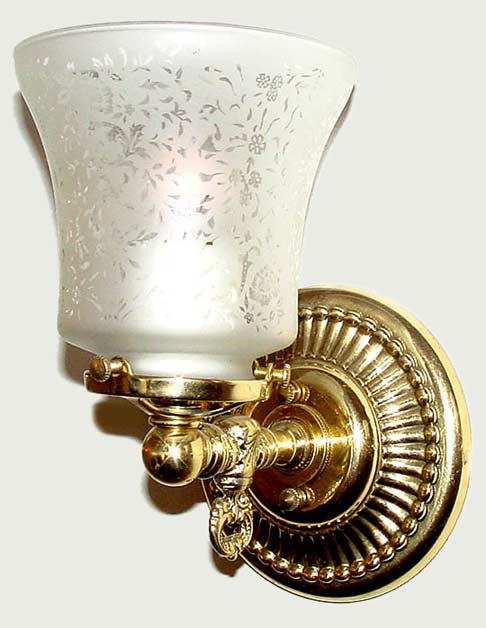 A simple yet elegant Colonial wall sconce with an etched floral pattern glass shade. Place this one anywhere, seriously. Perhaps a change in metal color might suit your existing decor better? Mount it up or down, in your bath, powder room, library, dining room and a shallow enough projection for the narrower hallway.