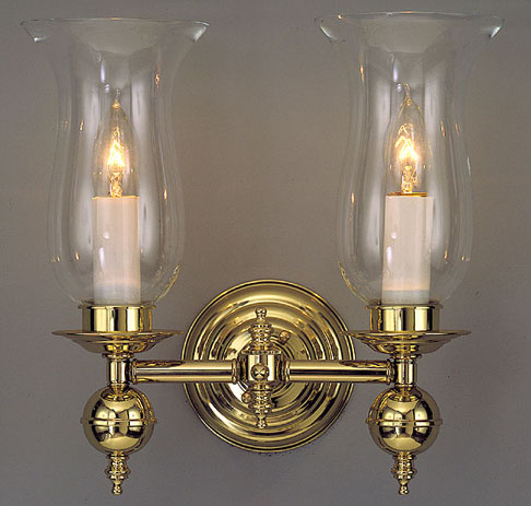 A simply gorgeous addition to any home or business. In high polish brass, this amazing reproduction colonial double wall sconce features crystal clear hurricane shades.