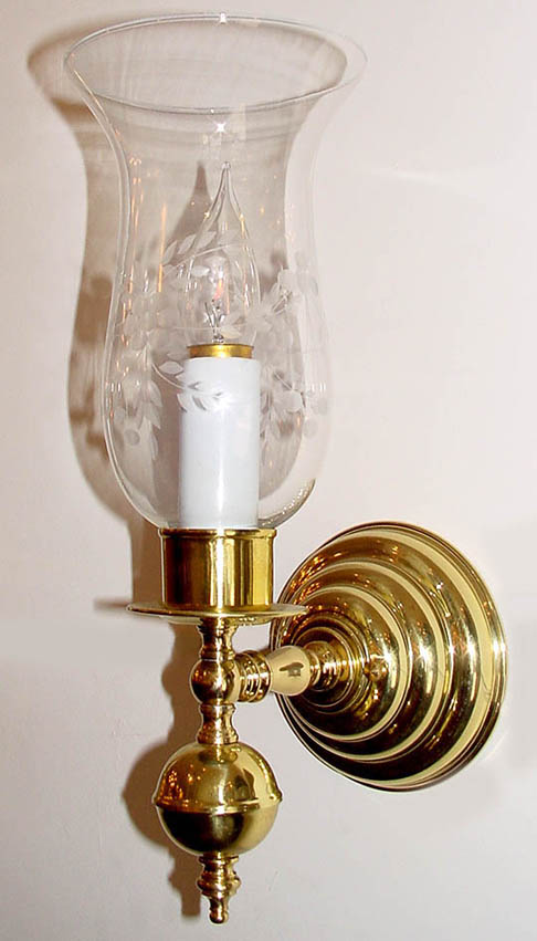 Beautiful in pairs. Another tasteful Colonial light reminiscent of the kind of candle sconce one might carry around in olden times. Wheat Etched hurricane glass dresses this polished brass beauty! Of course metal color is your choice.
