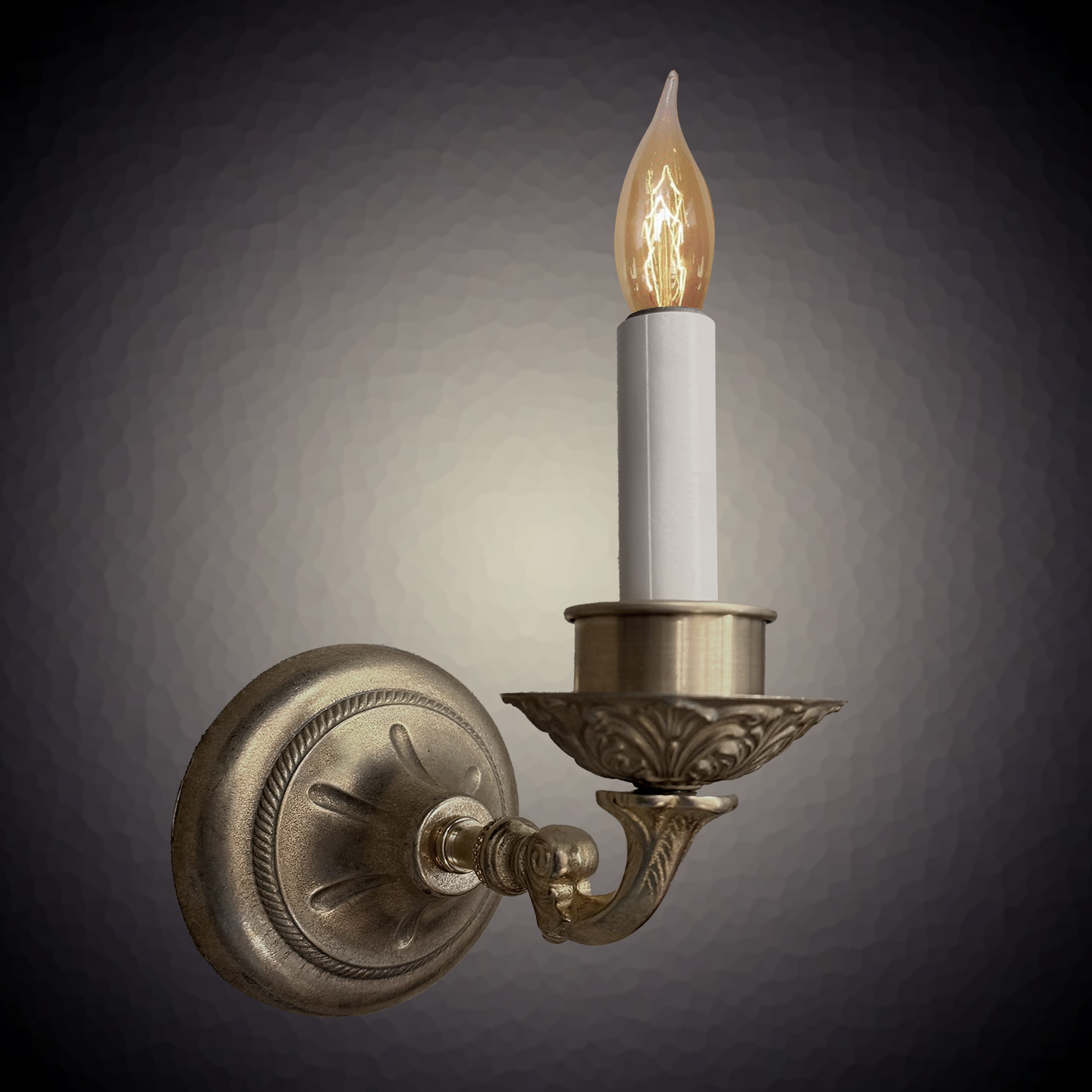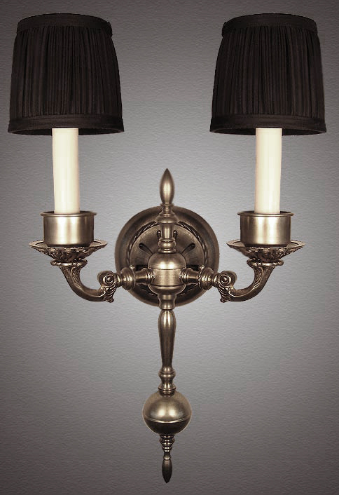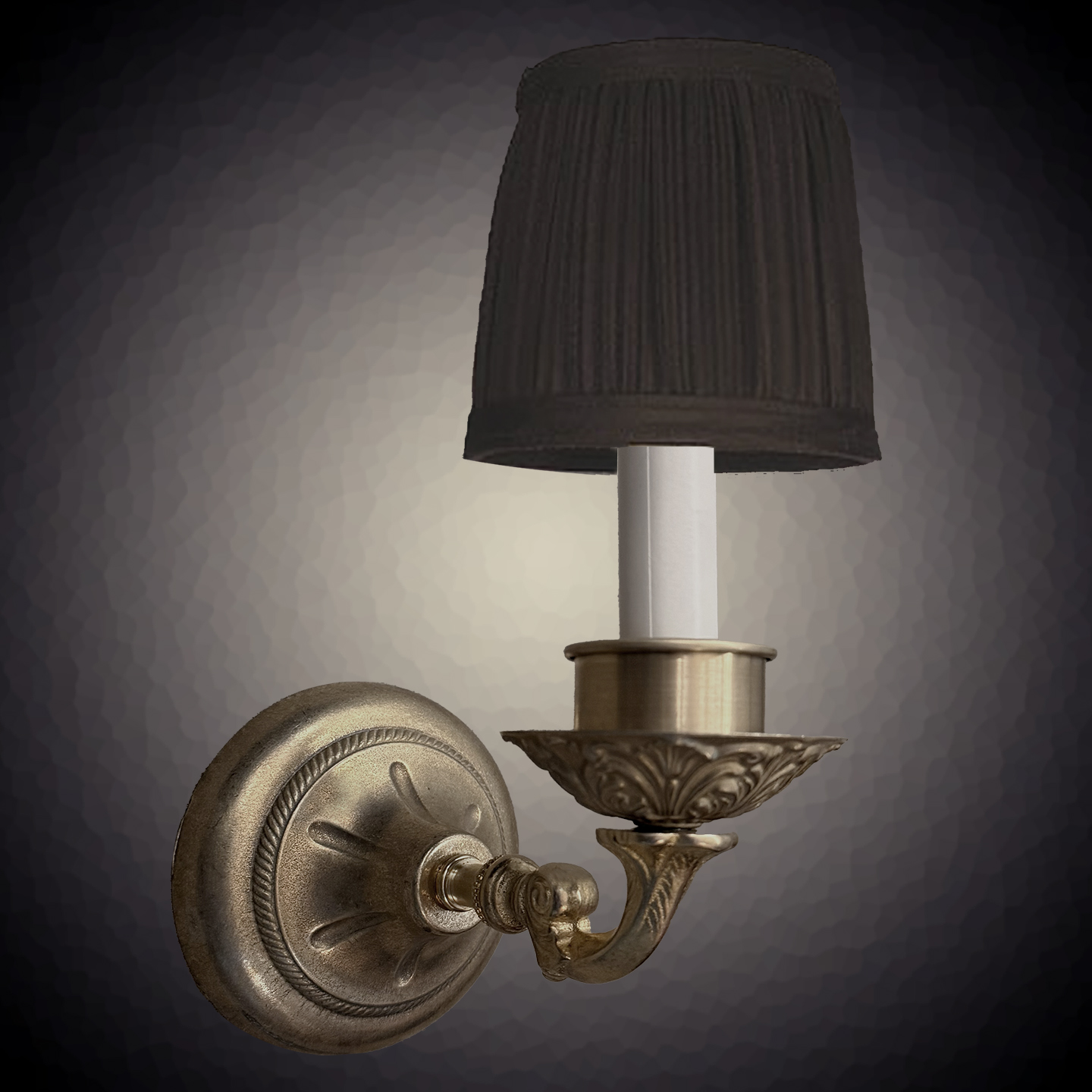 Very ornate and not for the weak at heart! A generous helping of 'Olde Colonial' hand craftsmanship. A beautiful candelabra wall light for your larger Powder room? Beside your fireplace? Solid brass construction and a petite black mushroom pleat fabric shades clip on to a candelabra base light bulb. Everything on this one makes the statement!