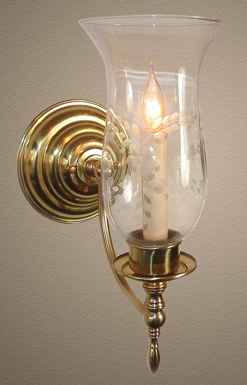 An early American or English Colonial hurricane wall sconce. Very classic in polished brass. Great in pairs around a brick fireplace or for subtle hallway lighting. Multi arm also available. Clip on Fabric Shade also works well here.